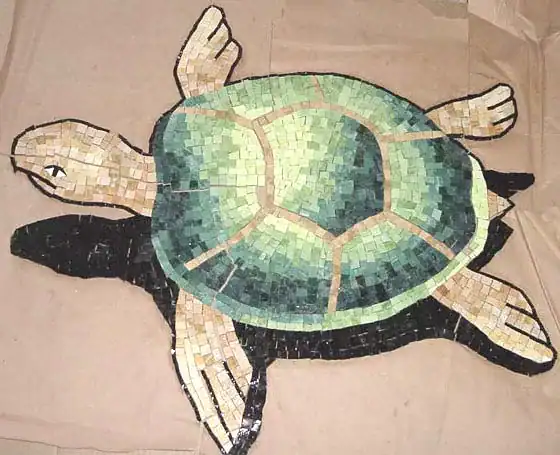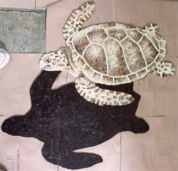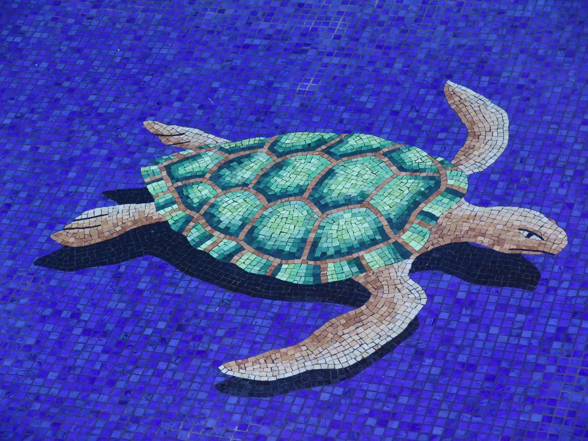 The turtle pool mosaic should be placed in the deep end of the pool to create a realistic effect when the water moves. The head of the turtle should be facing the deep end to create the illusion of the turtle swimming.