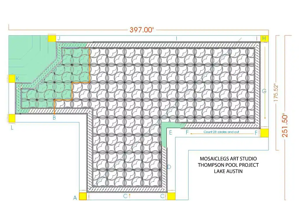 Mosaiclegs Art Studio designed and fabricated this pool mosaic as a one-of-a-kind installation for a high-end residential setting. The project includes a 50-foot lap lane, integrated spa areas, and a repeating circular motif that brings structure, rhythm, and visual movement to the entire pool.