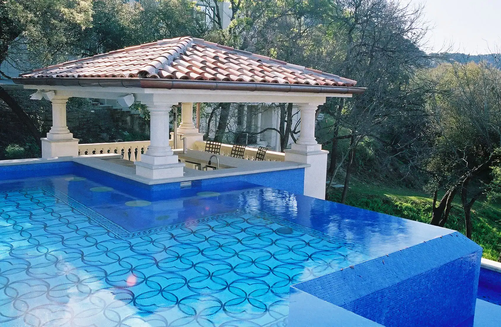 Unlike standard pool finishes, this geometric mosaic glass design was developed to function as both surface and artwork. The pattern interacts with light, water, and perspective to create a luxurious visual effect throughout the day.