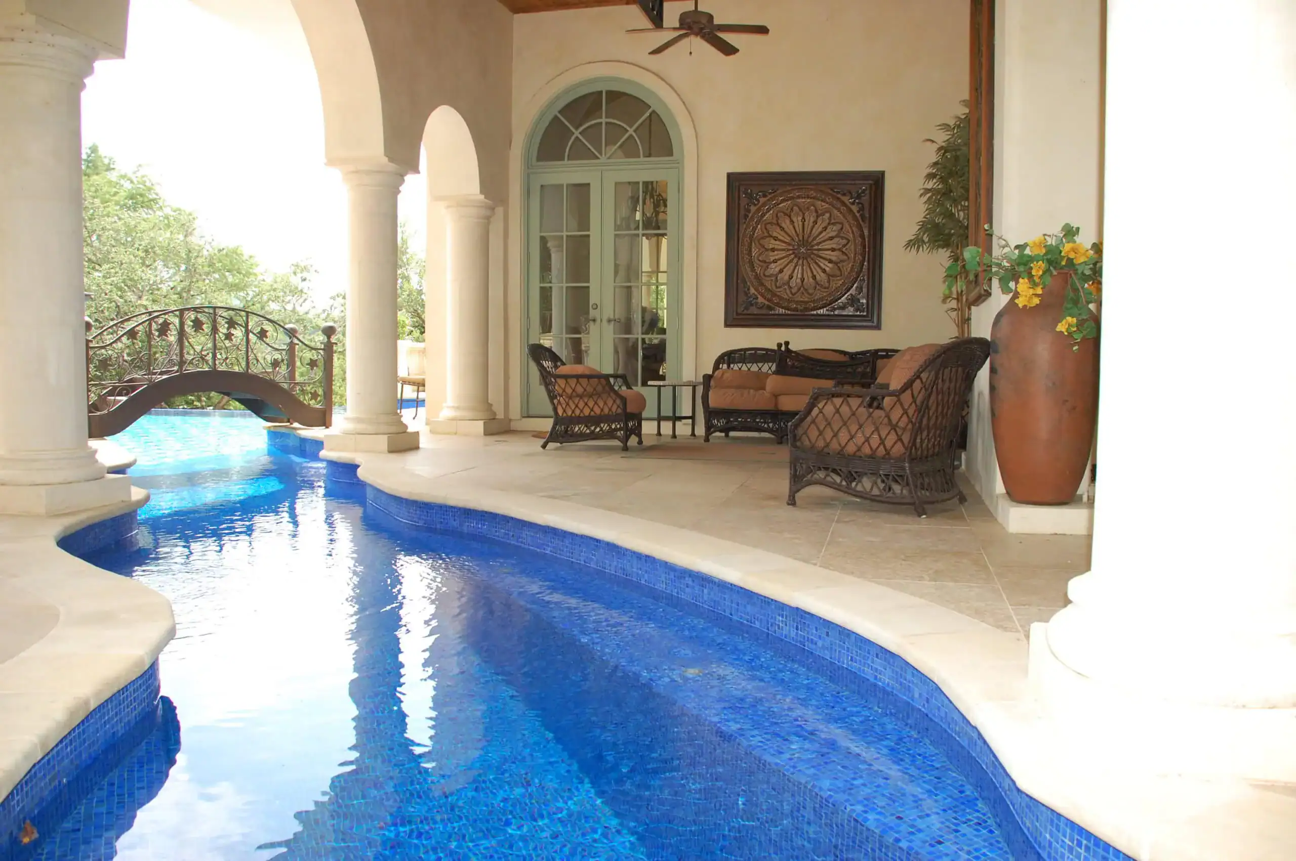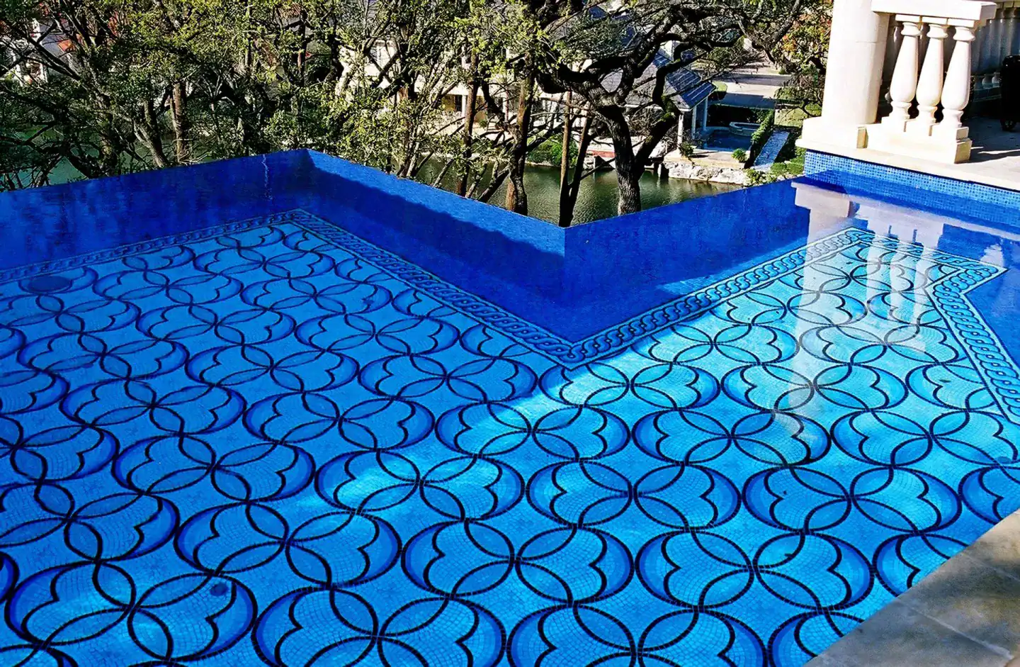 This custom geometric mosaic glass pool was created for the Thompson on Lake Austin project as a luxury swimming pool and spa design inspired by the iconic Burj Al Arab Jumeirah in Dubai. The composition features overlapping circular forms, creating a bold geometric pattern that gives the water a refined, architectural character.