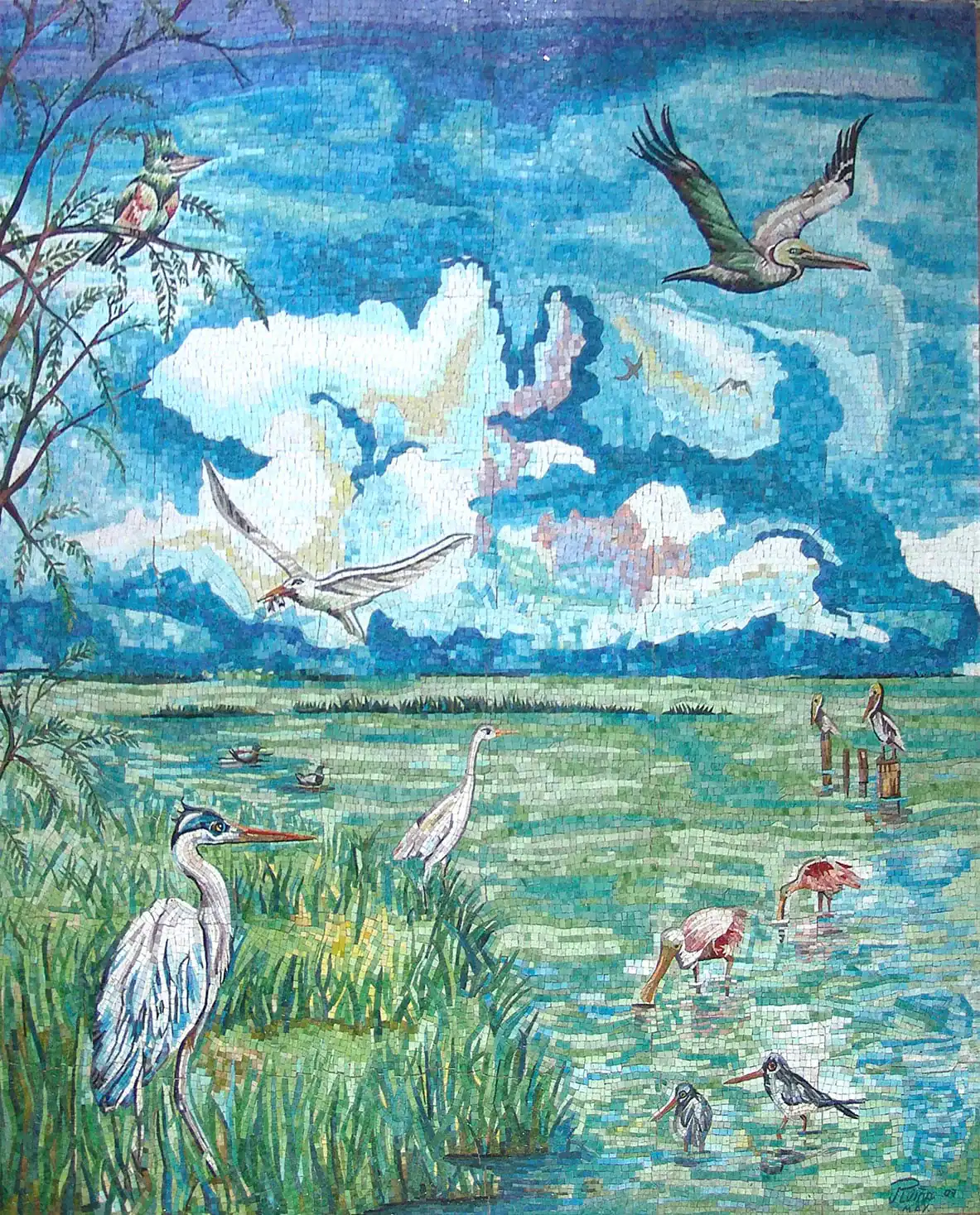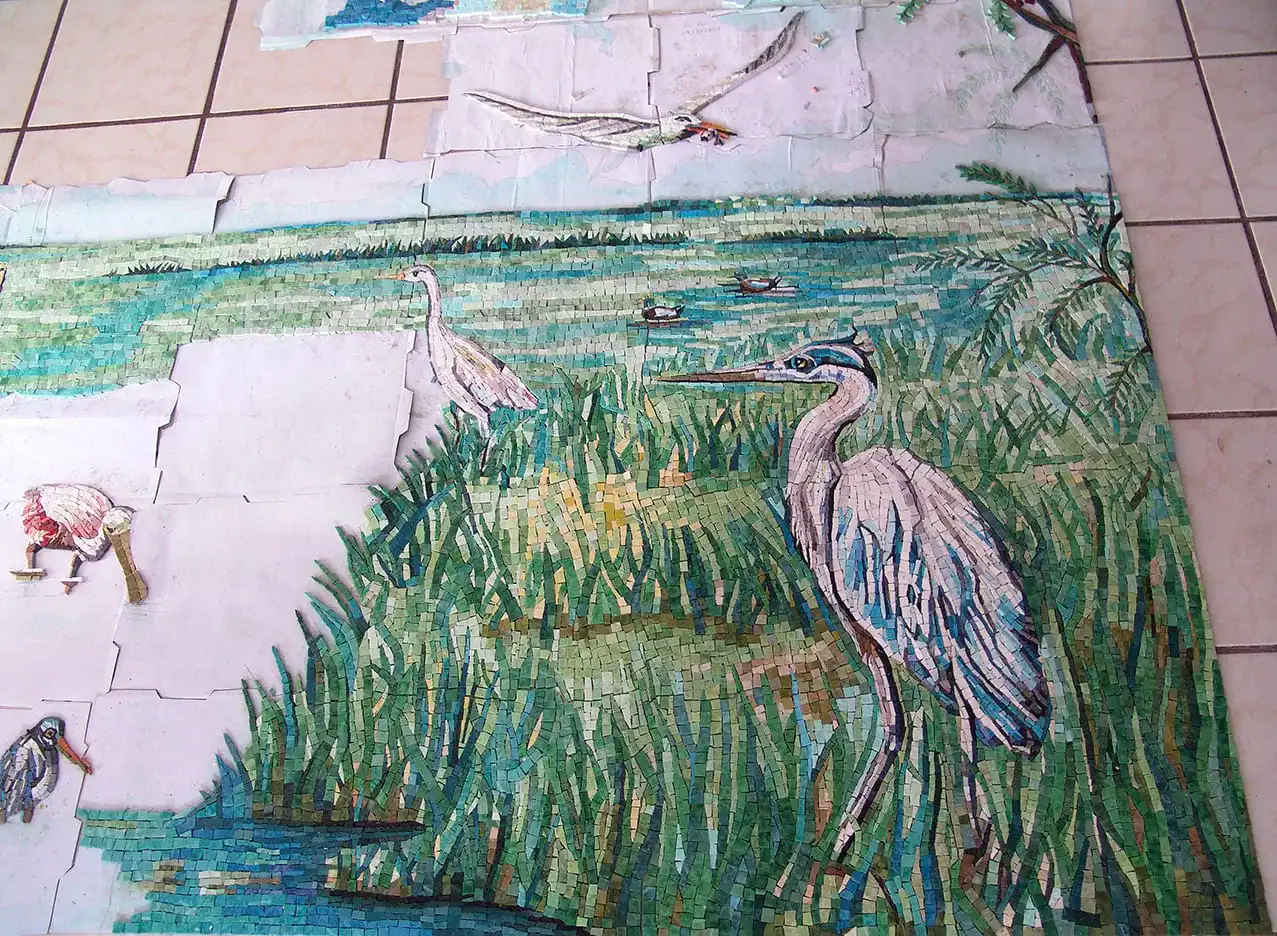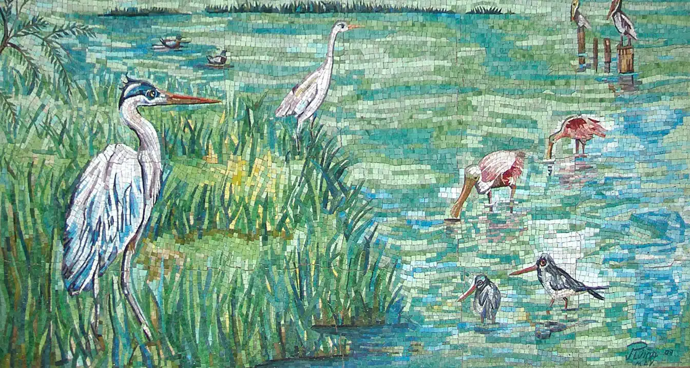This is a Custom Mosaic mural wall art of the Gulf of Mexico, it features birds of different types such as Kingfishers, spoonbills, Blue Herons, Pelicans etc.