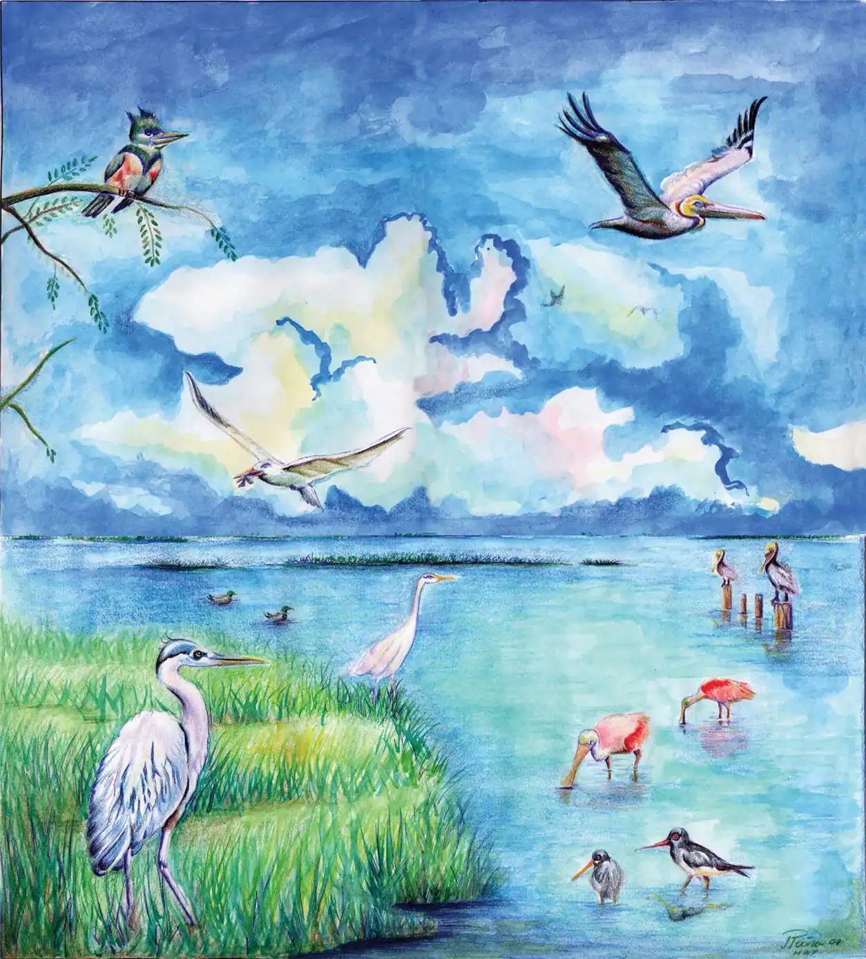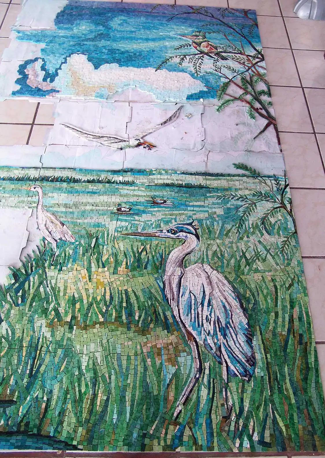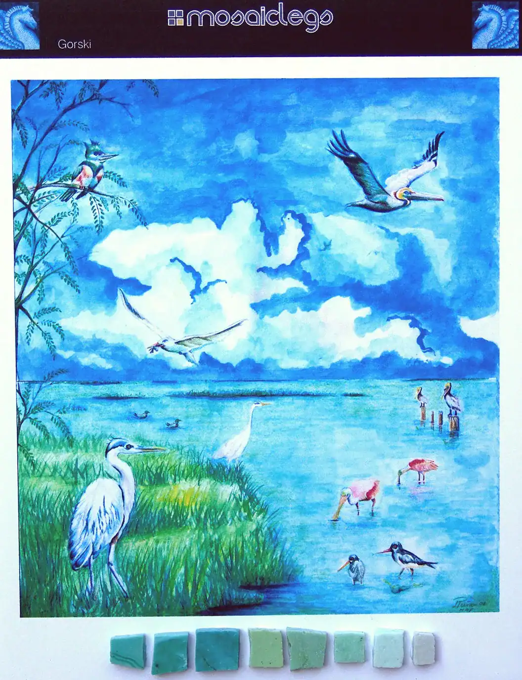 This is a Custom Mosaic mural wall art of the Gulf of Mexico, it features birds of different types such as Kingfishers, spoonbills, Blue Herons, Pelicans etc.