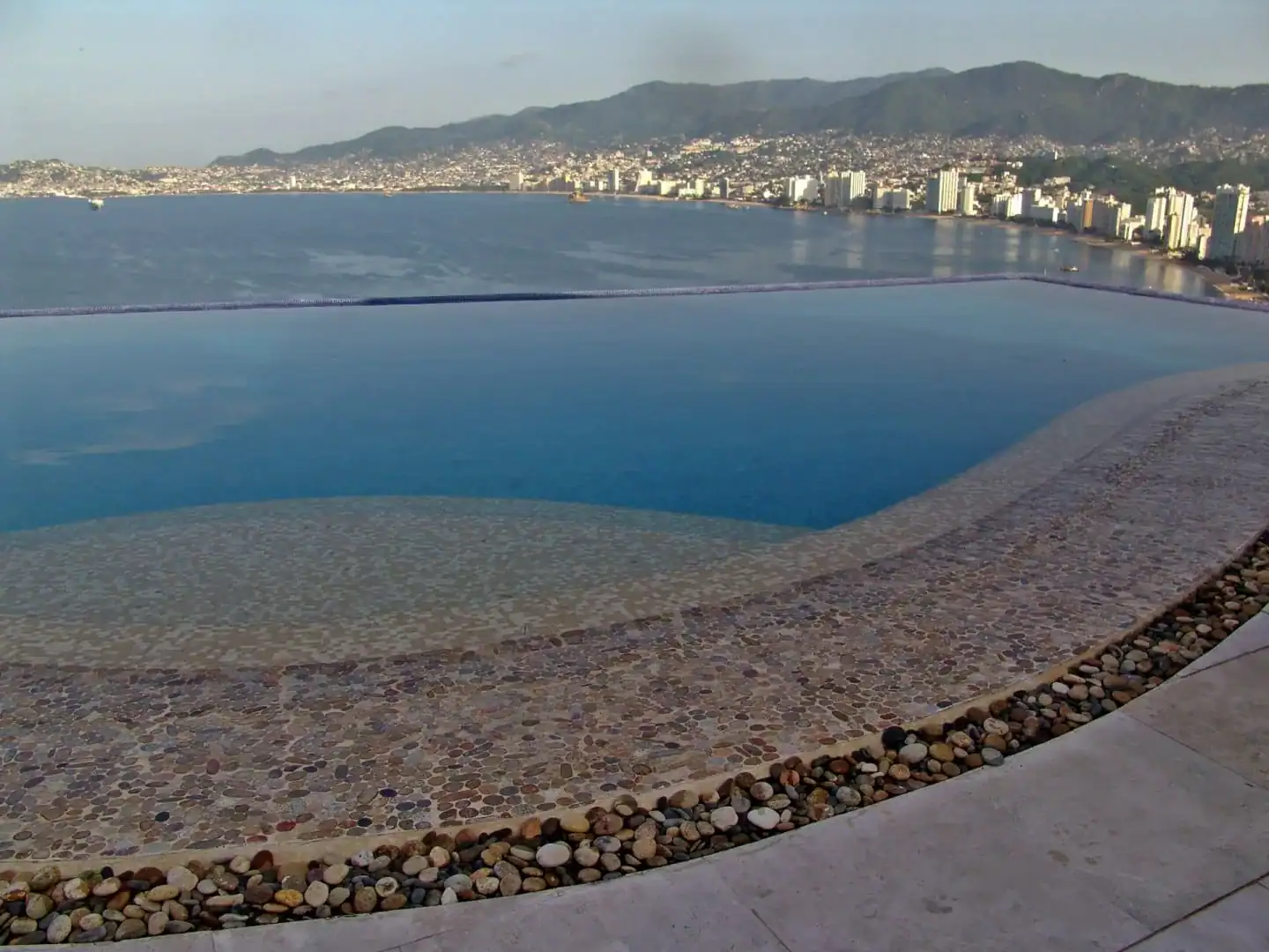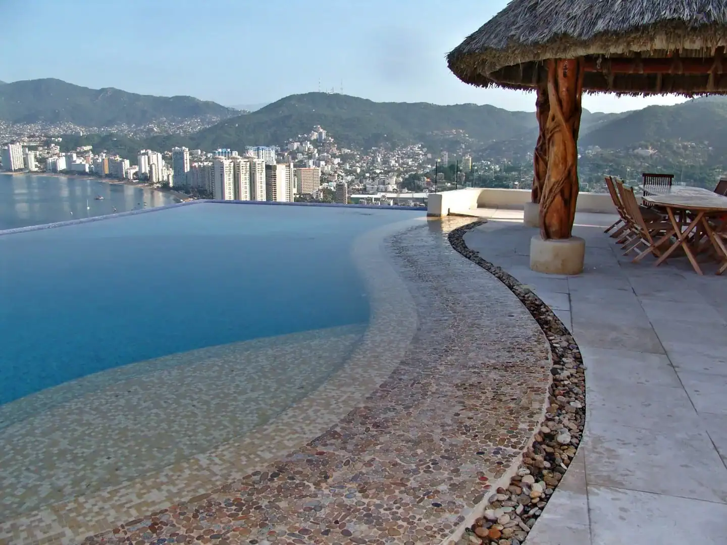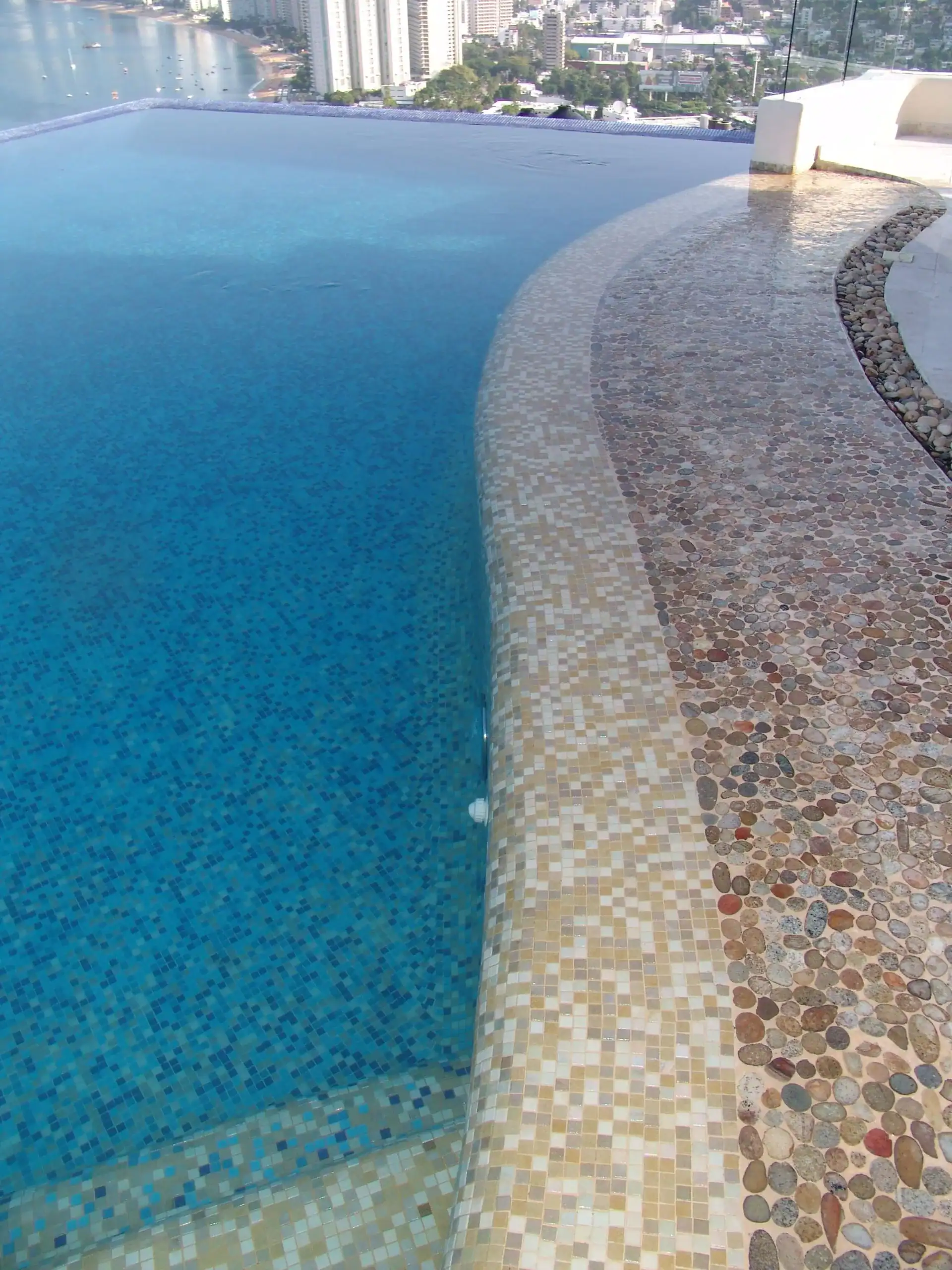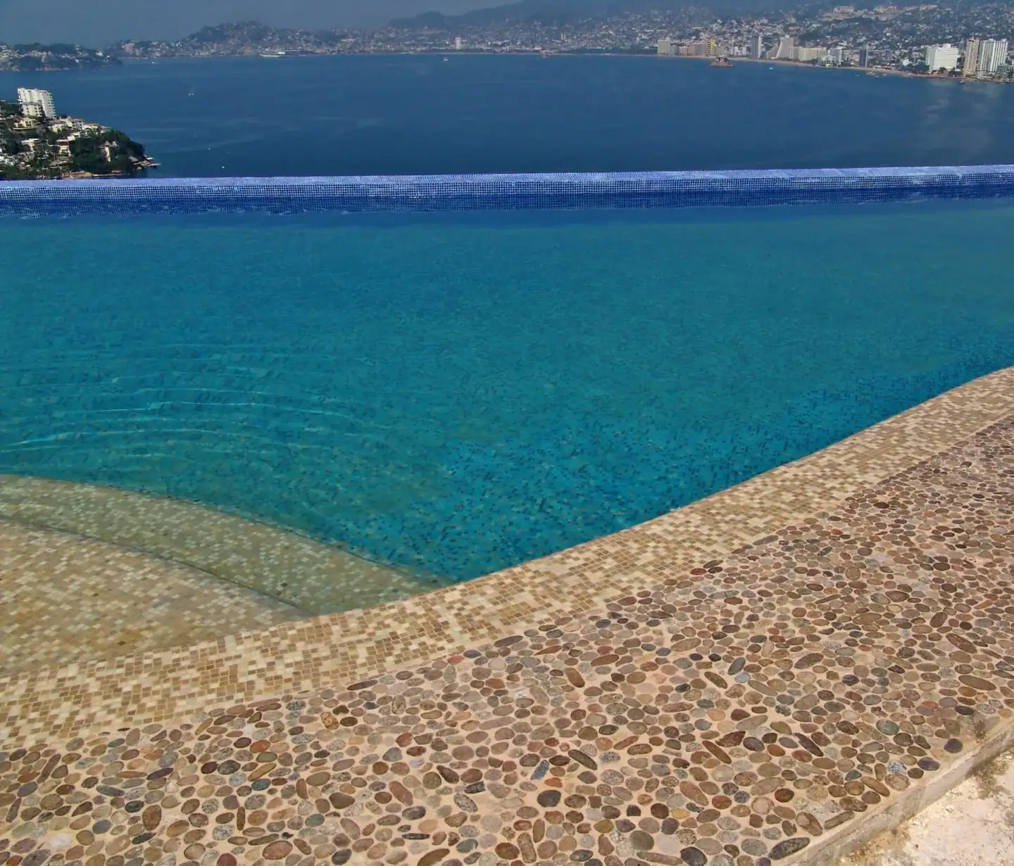 This Acapulco project demonstrates how river rock mosaic pool coping can transform a pool edge into a feature that feels integrated with nature rather than imposed on it.
